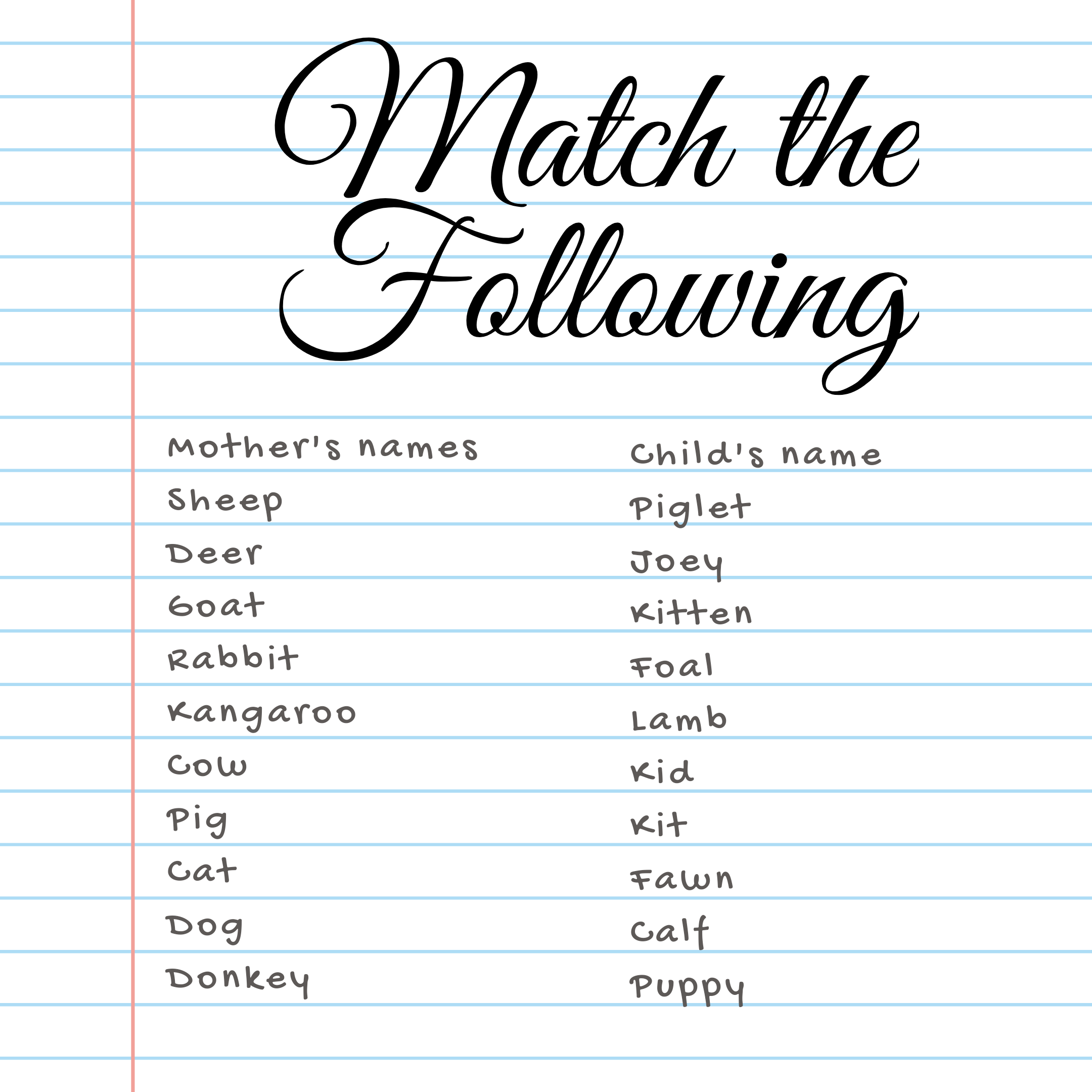 Match the animal names with their kid’s names